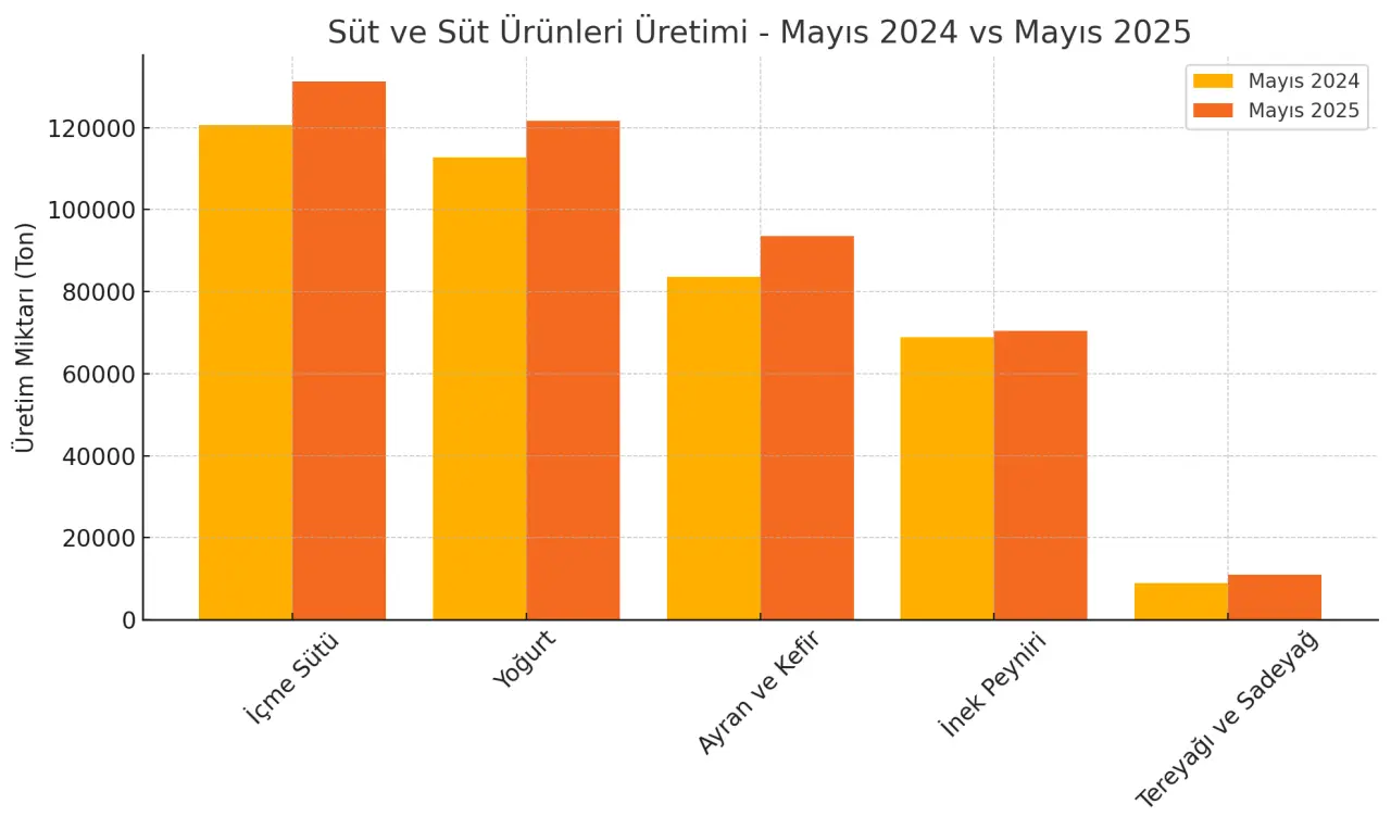 Süt ürünlerinde ise üretim artışı dikkat çekti. Mayıs ayında bir önceki yılın aynı ayına göre: