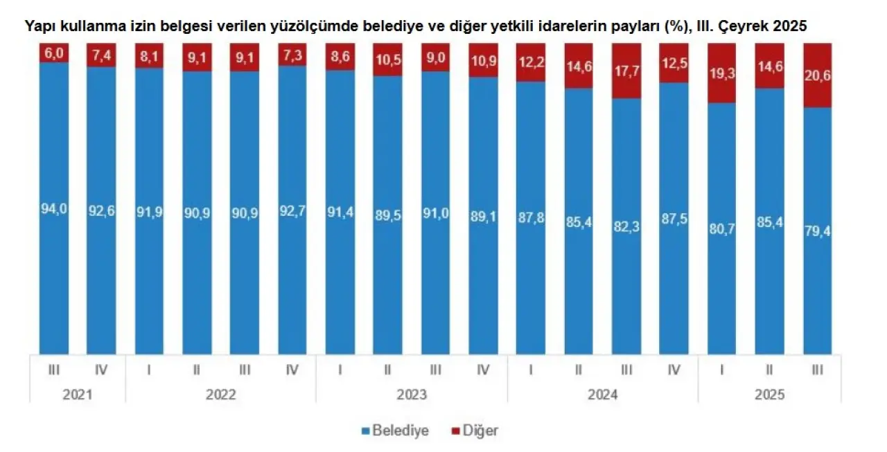 Yapı ruhsatı verilen yüzölçümün yüzde 78’i belediyeler tarafından düzenlendi. Bu veri, hâlihazırda Türkiye’de imar ve proje onay süreçlerinin ağırlıklı olarak yerel idareler eliyle yürütüldüğünü ortaya koyuyor. Diğer yetkili kurumların payı ise yüzde 22’de kaldı. Tamamlanmış yapıların göstergesi olan yapı kullanma izin belgesi de yükseliş eğilimini destekledi: