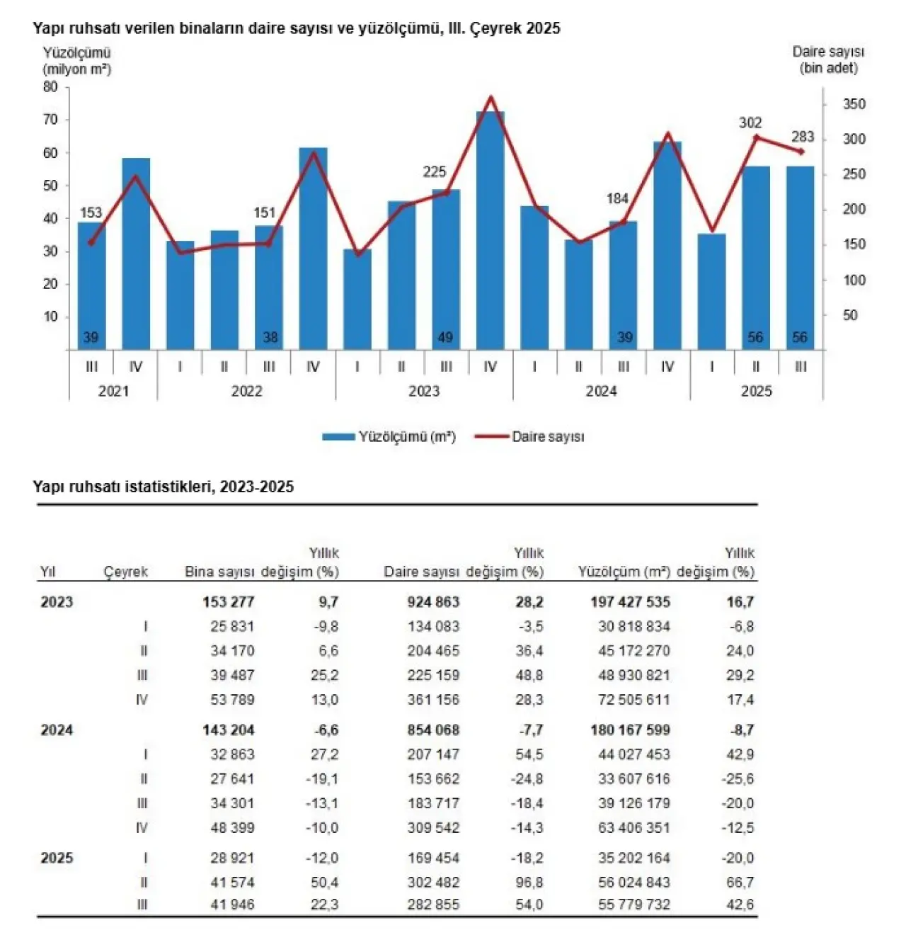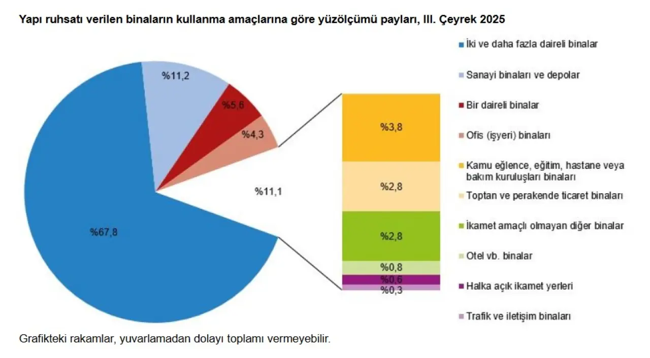 - Yüzölçümü yüzde Türkiye’de yapı izin istatistikleri, 2025 yılının üçüncü çeyreğinde inşaat sektöründe güçlü bir ivmelenme yaşandığını ortaya koydu. Yapı ruhsatı verilen bina ve daire sayıları sert yükselirken, çok daireli konut projeleri toplam yüzölçüm içinde en yüksek payı aldı; kullanım izinlerindeki artış da tamamlanan yapı hızının sürdüğünü gösterdi.3,7 arttı