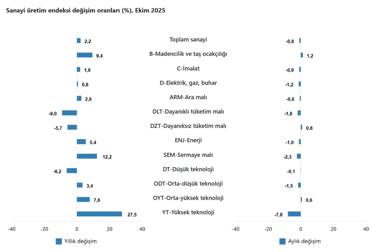Türkiye’de sanayi üretimi 2025 yılı Ekim ayında yıllık bazda büyümesini sürdürürken, aylık verilerde imalat sektöründeki düşüşün etkisiyle gerileme yaşandı. TÜİK’in açıkladığı Sanayi Üretim Endeksi’ne göre toplam sanayi üretimi yıllık %2,2 artış gösterdi, ancak aylık bazda %0,8 azaldı. 2025 yılı Ekim ayında sanayinin alt sektörleri yıllık bazda şöyle performans sergiledi: