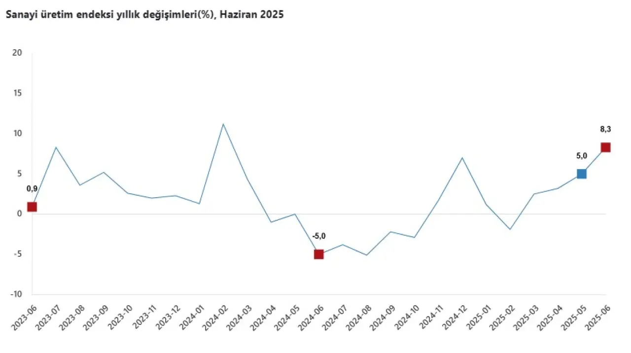 Türkiye’de sanayi üretimi 2025 yılının Haziran ayında yıllık bazda yüzde 8,3 artış gösterdi. Özellikle imalat sanayi sektöründeki güçlü performans, toplam üretimi yukarı çekerken, elektrik, gaz ve buhar üretimindeki hafif düşüş bu büyümeyi sınırladı