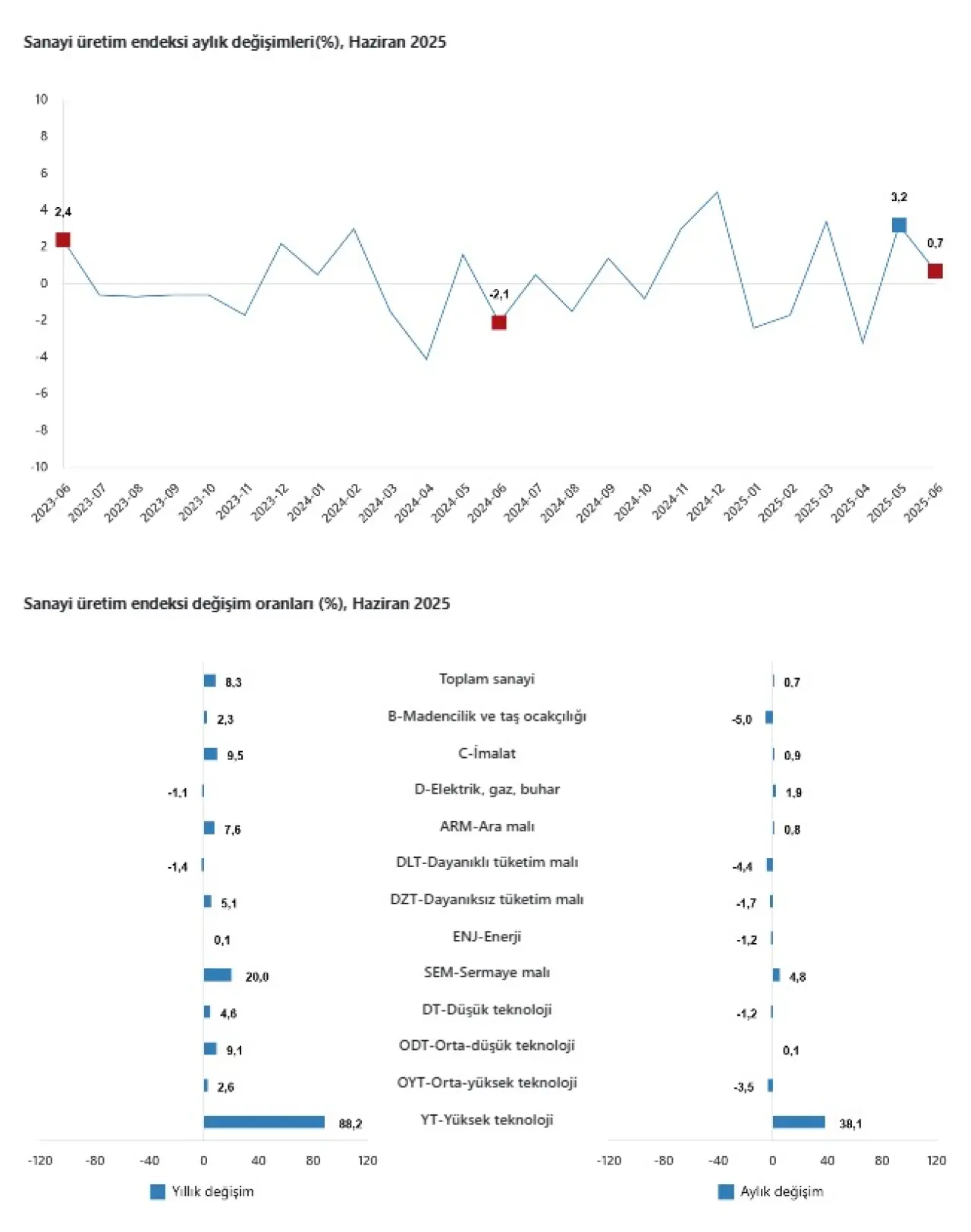 Sanayi üretimi, teknoloji yoğunluğuna göre de değerlendirildiğinde; orta-yüksek teknoloji ve yüksek teknoloji sektörlerinde artışlar dikkat çekiyor. Ayrıca ara malı, dayanıklı ve dayanıksız tüketim malı üretiminde de yıllık büyüme gözleniyor. Sermaye malı üretimi ise sektörün yatırımlarındaki hareketliliği yansıtıyor. Sanayi üretimi, Türkiye ekonomisinin büyümesinde kilit rol oynuyor. Haziran ayında gerçekleşen yüzde 8,3’lük yıllık artış, üretim kapasitesinin ve talebin yükseldiğini gösteriyor. Ancak alt sektörlerdeki dalgalanmalar, ekonomik aktivitenin dengeli ve sürdürülebilir bir şekilde büyümesi için daha fazla odağa ihtiyaç duyulduğunu ortaya koyuyor.