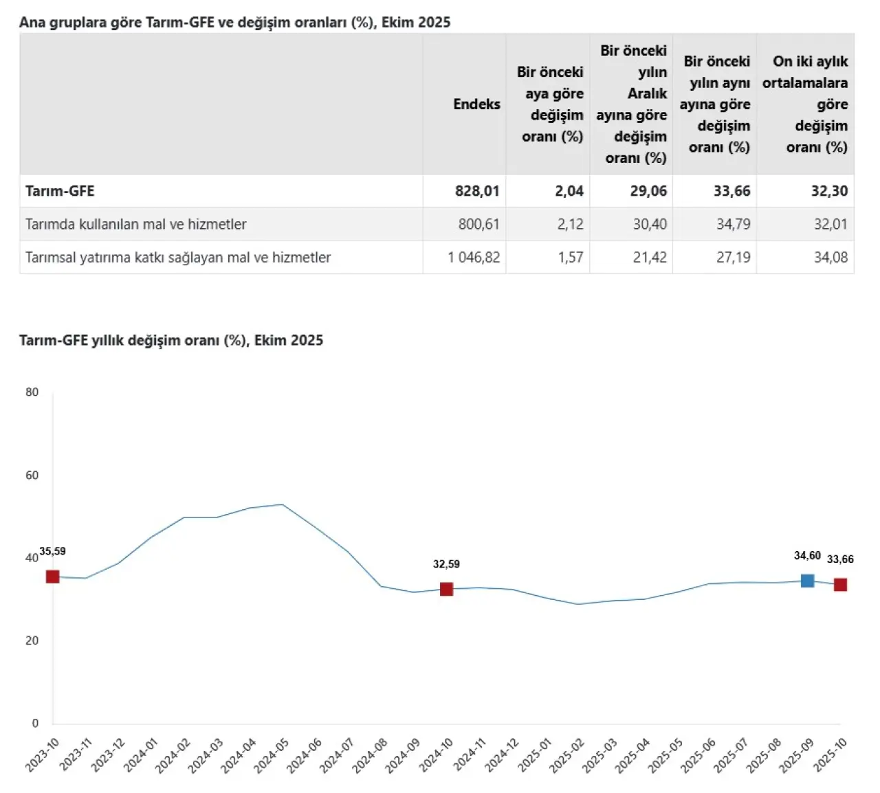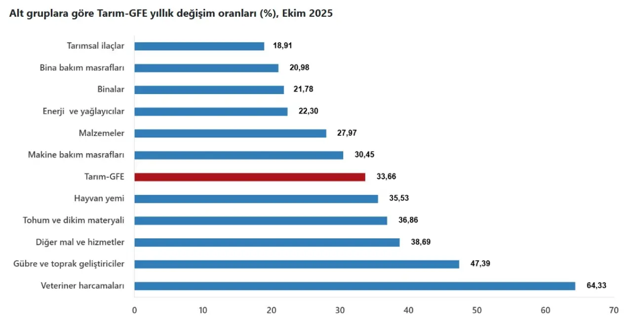 Tarım-GFE (2020=100), Ekim ayında bir önceki aya göre yüzde 2,04, 2024 Aralık ayına göre yüzde 29,06 ve geçen yılın aynı ayına göre yüzde 33,66 yükseldi. On iki aylık ortalamalara göre artış ise yüzde 32,30 seviyesinde gerçekleşti. Bu tablo, üreticinin maliyet yükünün yıl boyunca kesintisiz biçimde arttığını gösteriyor.