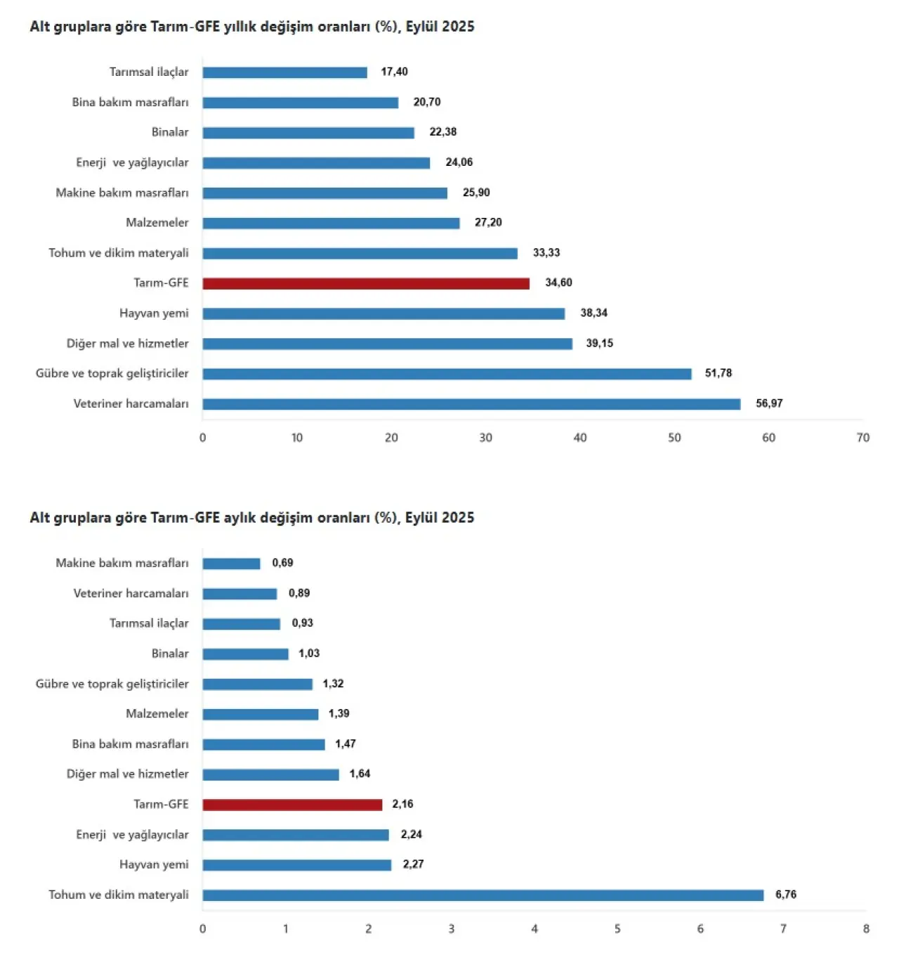 Eylül ayı alt kalem verileri, maliyetlerdeki artışın özellikle hayvancılığı daha da zorladığını ortaya koydu. Veteriner harcamaları yıllık yüzde 56,97 artışla tüm alt gruplar arasında en yüksek yükselişi yaşadı. Bu artış, hayvansal üretimde maliyet yükünü artırarak kırmızı ve beyaz et fiyatlarına doğrudan etki eden kritik bir başlık olarak dikkat çekiyor. Aylık bazda en yüksek artış ise yüzde 6,76 ile tohum ve dikim materyalinde gerçekleşti. Bu artış, yeni ekim dönemine hazırlanan çiftçilerin maliyetlerinin daha da ağırlaştığını ve üretim planlamalarında etkili bir baskı yarattığını gösteriyor.