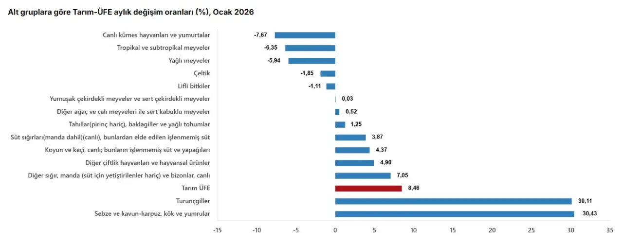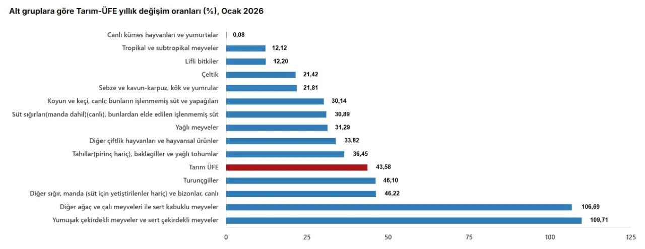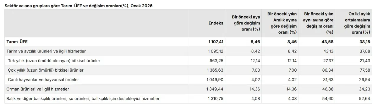 Ocak 2026 dönemine ilişkin Tarım Ürünleri Üretici Fiyat Endeksi (Tarım-ÜFE) verileri açıklandı. 2020=100 referans yıllı endekse göre Tarım-ÜFE, bir önceki aya göre yüzde 8,46 artarken, yıllık bazda artış yüzde 43,58 olarak gerçekleşti. On iki aylık ortalamalara göre artış ise yüzde 38,18 oldu. Endeks, bir önceki yılın Aralık ayına göre de yüzde 8,46 yükseldi. Böylece tarım üretici fiyatlarında yılın ilk ayında güçlü bir artış kaydedildi.