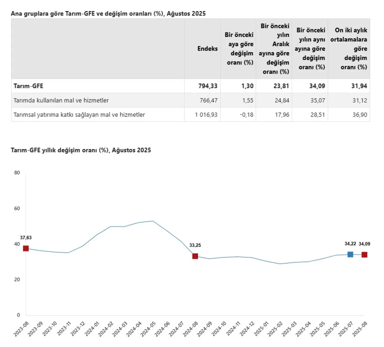 Tarımsal Girdi Fiyat Endeksi (Tarım-GFE) 2025 yılı Ağustos ayında yıllık bazda %34,09, aylık bazda ise %1,30 artış kaydetti. Tarımda kullanılan mal ve hizmetlerdeki fiyat artışı, üretim maliyetlerinin çiftçi üzerindeki baskısını bir kez daha ortaya koydu.