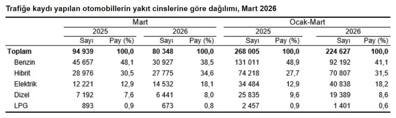İlk çeyrekte trafiğe kaydı yapılan otomobillerde benzinli araçlar yüzde 41,1 ile ilk sırada yer aldı. Hibrit araçların payı yüzde 31,5’e ulaşırken, elektrikli otomobiller yüzde 18,2 ile dikkat çekici bir seviyeye çıktı. Dizel araçların payının yüzde 8,6’ya gerilemesi, tüketici tercihlerinde dönüşümün hızlandığını ortaya koydu.