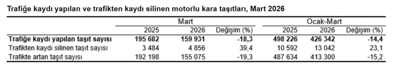 Ocak-Mart döneminde trafiğe kaydı yapılan toplam taşıt sayısı geçen yılın aynı dönemine göre yüzde 14,4 azalarak 426 bin 342’ye geriledi. Aynı dönemde trafikten kaydı silinen taşıt sayısı ise yüzde 23,1 artış gösterdi. Böylece yılın ilk çeyreğinde toplam taşıt sayısında net 413 bin 300 adetlik artış kaydedildi.