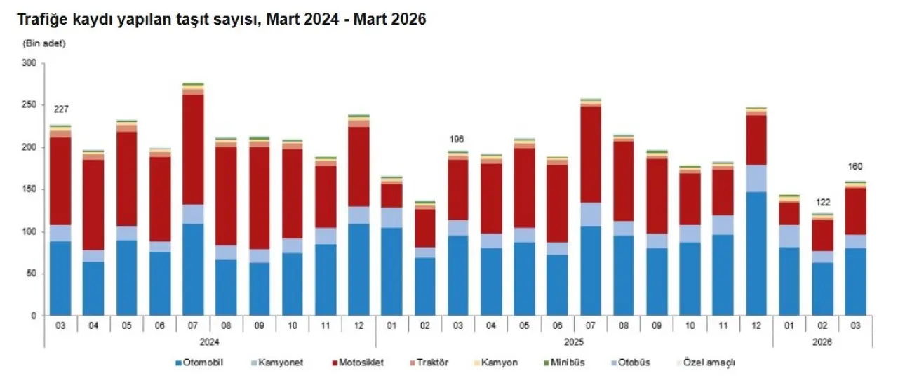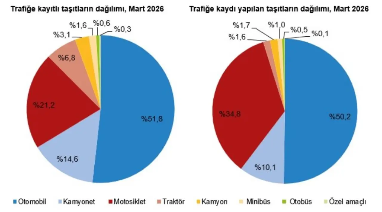 Mart ayında trafiğe kaydı yapılan toplam taşıt sayısı 159 bin 931 olarak gerçekleşti. Bu taşıtların yarısından fazlasını otomobiller oluşturdu. Otomobil yüzde 50,2 ile ilk sırada yer alırken, motosiklet yüzde 34,8 ile ikinci sırada konumlandı. Kamyonetlerin payı yüzde 10,1 olurken diğer taşıt türleri daha sınırlı oranlarda kaldı.