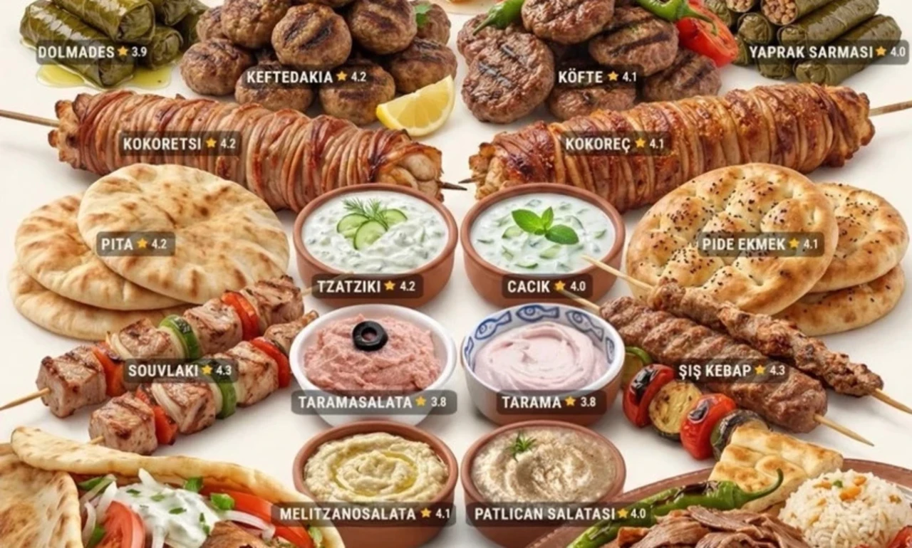Paylaşımda, hem Türkiye’de hem de Yunanistan’da bilinen ve benzer tariflerle hazırlanan birçok yemek yer aldı. Bu yemekler zaman zaman iki ülke arasında tatlı bir gastronomi rekabetine de konu oluyor. TasteAtlas’ın paylaştığı görselde yer alan ve iki mutfakta da benzer şekilde hazırlanan yemeklerden bazıları şunlar: