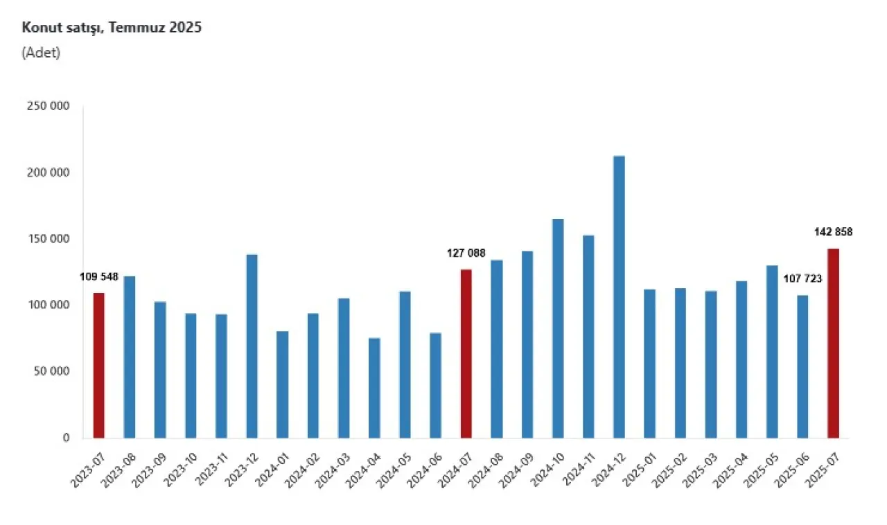 Türkiye genelinde konut piyasası, Temmuz ayında geçen yılın aynı dönemine göre %12,4’lük artış kaydetti. TÜİK’in açıkladığı verilere göre, ay boyunca 142 bin 858 konut satıldı. Satışların en fazla gerçekleştiği iller İstanbul (23 bin 152), Ankara (12 bin 491) ve İzmir (7 bin 815) oldu. En düşük satış ise Ardahan (58), Bayburt (93) ve Hakkari (103)’te gerçekleşti.