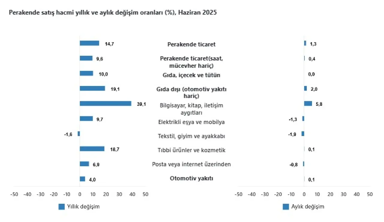 Perakende ticaretin alt kalemlerine bakıldığında, gıda, içecek ve tütün ürünlerinde artış gözlenirken; gıda dışı kategoride (otomotiv yakıtı hariç) özellikle bilgisayar, kitap, iletişim cihazları, elektrikli eşya ve mobilya, tekstil, giyim ve ayakkabı, tıbbi ürünler ile kozmetik satışlarında yukarı yönlü bir ivme dikkat çekti. İnternet ve posta yoluyla yapılan satışlar da aylık ve yıllık bazda büyüme kaydetti. Ekonomi çevreleri, toptan ticaretteki güçlü artışın üretim ve ihracat talebindeki toparlanmaya işaret ettiğini, perakende satışlardaki istikrarlı artışın ise iç talepte dirençli bir seyrin sürdüğünü belirtiyor.