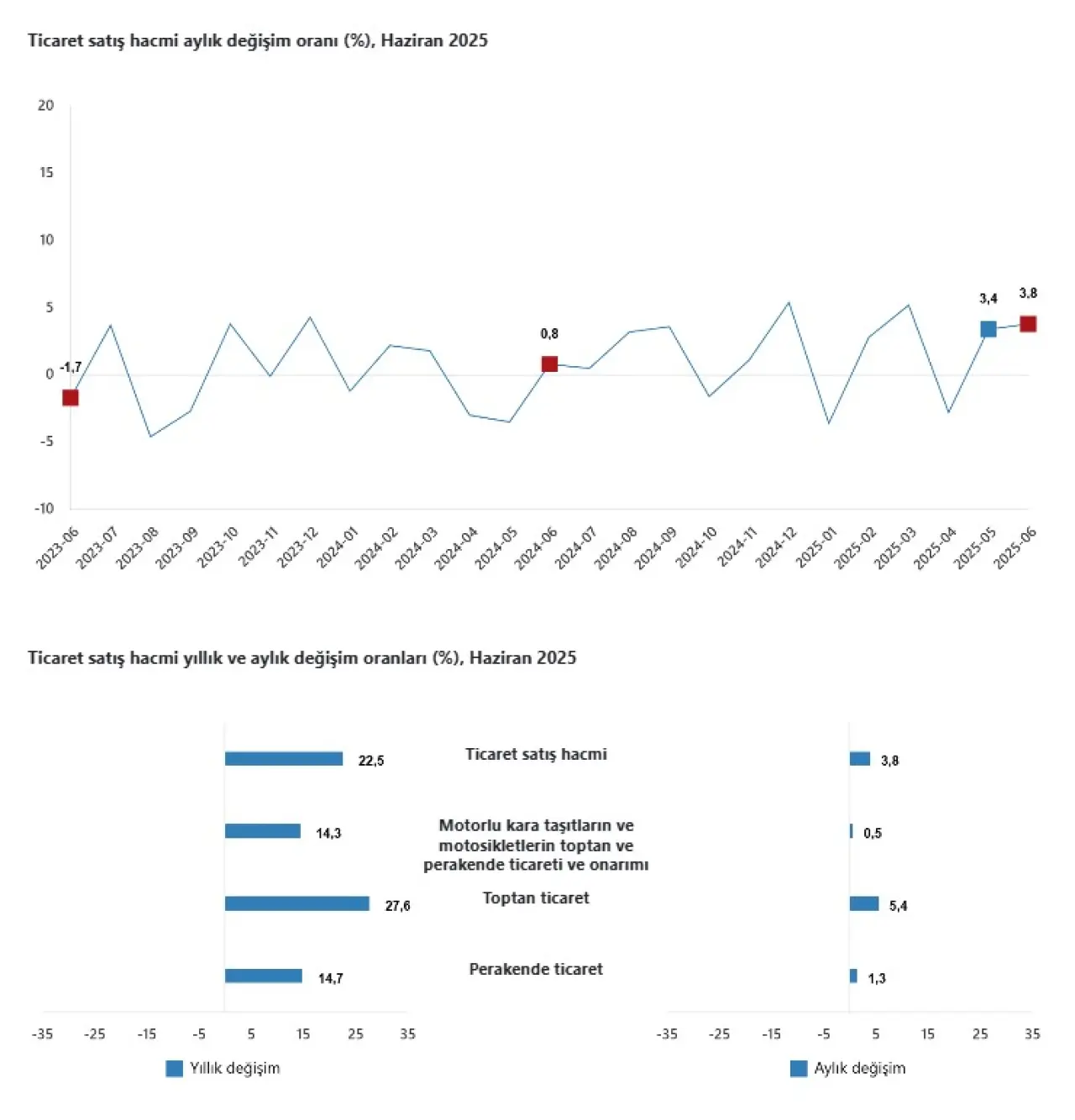 Haziran’da motorlu kara taşıtları ve motosikletlerin ticareti ile onarım faaliyetlerindeki satış hacmi yıllık yüzde 14,3 artarken, toptan ticaret satış hacmi yüzde 27,6 ile en yüksek artışı kaydetti. Perakende ticaret ise yüzde 14,7 yükseldi. Mevsim ve takvim etkilerinden arındırılmış verilere göre, ticaret satış hacmi bir önceki aya kıyasla yüzde 3,8 arttı. Alt kırılımlara bakıldığında motorlu araç ticareti yüzde 0,5, toptan ticaret yüzde 5,4 ve perakende ticaret yüzde 1,3 yükseldi.