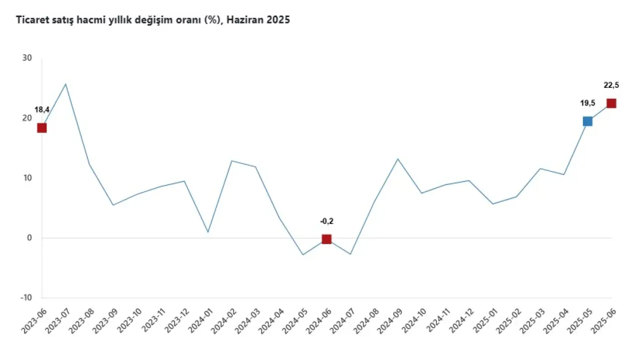 Türkiye İstatistik Kurumu (TÜİK) verilerine göre, 2025 yılı Haziran ayında ticaret satış hacmi yıllık bazda yüzde 22,5, perakende satış hacmi ise yüzde 14,7 artış gösterdi. Ekonomideki canlı talebin sinyallerini veren rakamlar, toptan ticarette daha hızlı bir büyüme yaşandığını ortaya koydu.