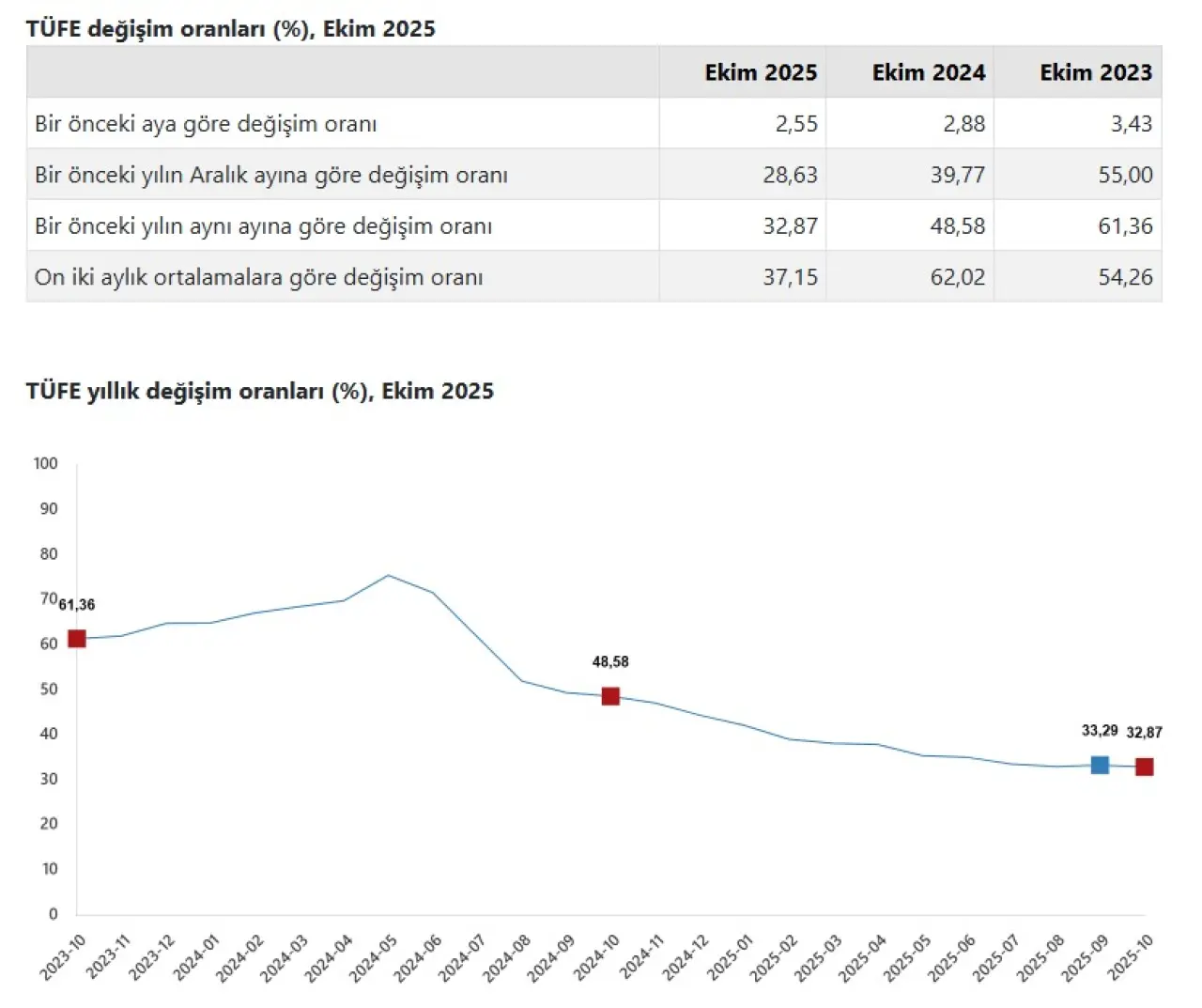 TÜİK, Ekim 2025 Tüketici Fiyat Endeksi verilerini açıkladı. TÜFE, aylık %2,55, yıllık %32,87 arttı. Fiyat artış hızında geçen yıla göre gerileme görülse de, gıda ve konut kalemlerindeki yüksek oranlar enflasyon baskısının sürdüğünü gösteriyor