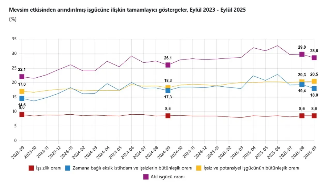 Eylül 2025 döneminde Türkiye’de mevsim etkilerinden arındırılmış işsizlik oranı %8,6 olarak sabit kalırken, istihdam edilenlerin sayısı bir önceki aya göre 200 bin kişi azaldı ve istihdam oranı %0,3 düşüşle %48,9’a geriledi. Genç nüfusta işsizlik ise %14,9 ile dikkat çekti