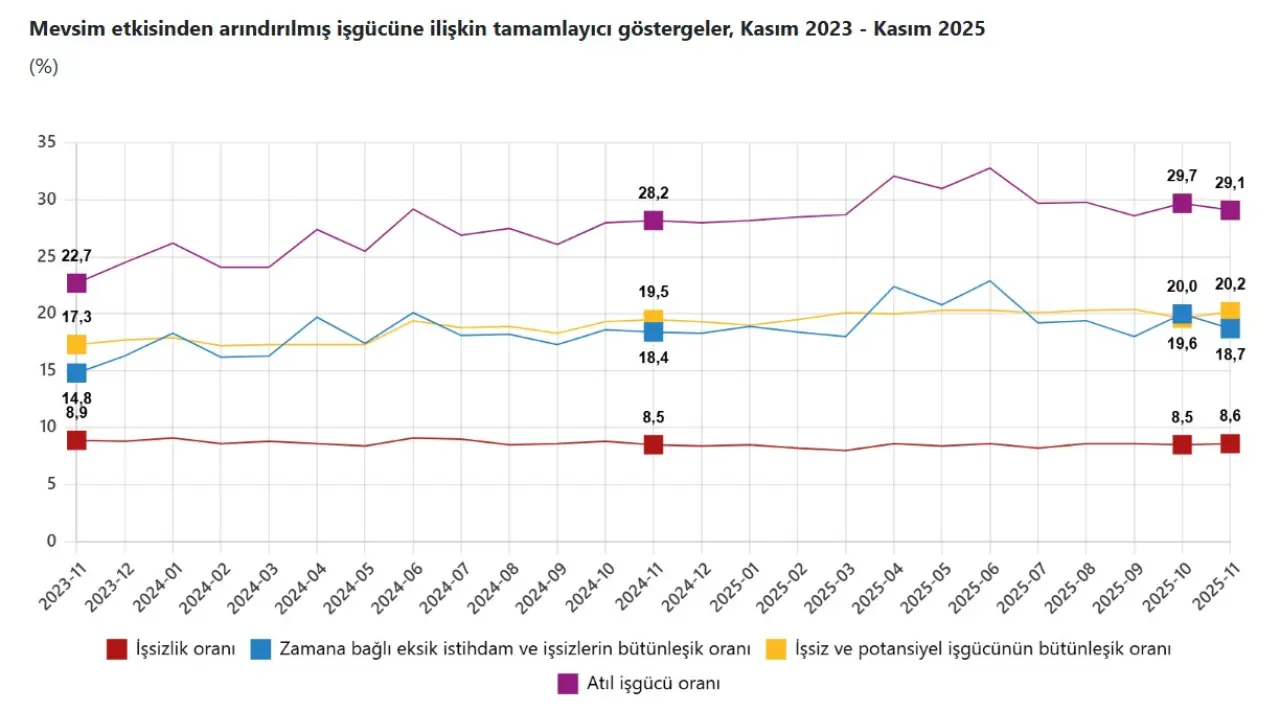 Zamana bağlı eksik istihdam, potansiyel işgücü ve işsizlerden oluşan atıl işgücü oranı, Kasım ayında 0,6 puanlık düşüşle yüzde 29,1 olarak hesaplandı.