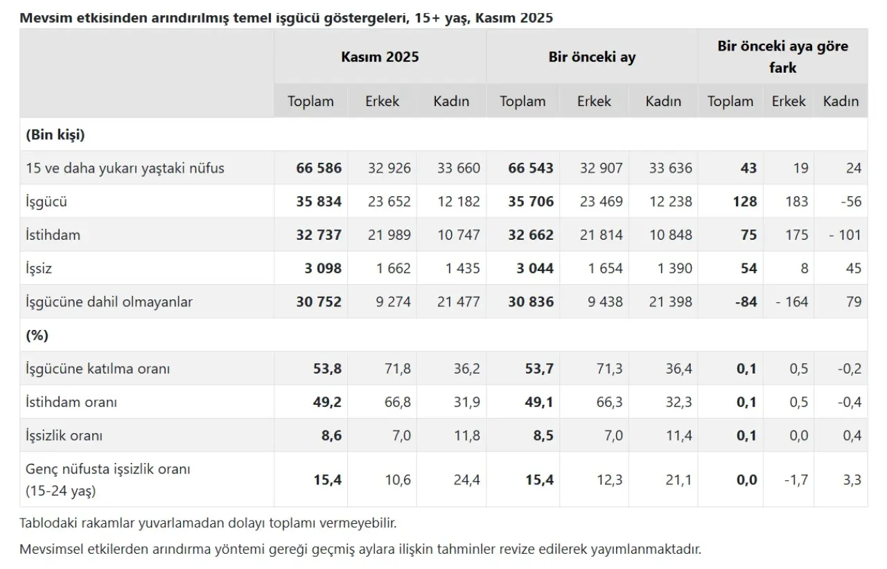 İşgücü Kasım ayında 128 bin kişi artarak 35 milyon 834 bin kişiye çıktı. İşgücüne katılma oranı 0,1 puan artışla yüzde 53,8 olarak kaydedildi. Erkeklerde işgücüne katılma oranı yüzde 71,8, kadınlarda ise yüzde 36,2 oldu. Kadınların işgücü piyasasına katılımındaki yapısal zayıflık sürüyor.