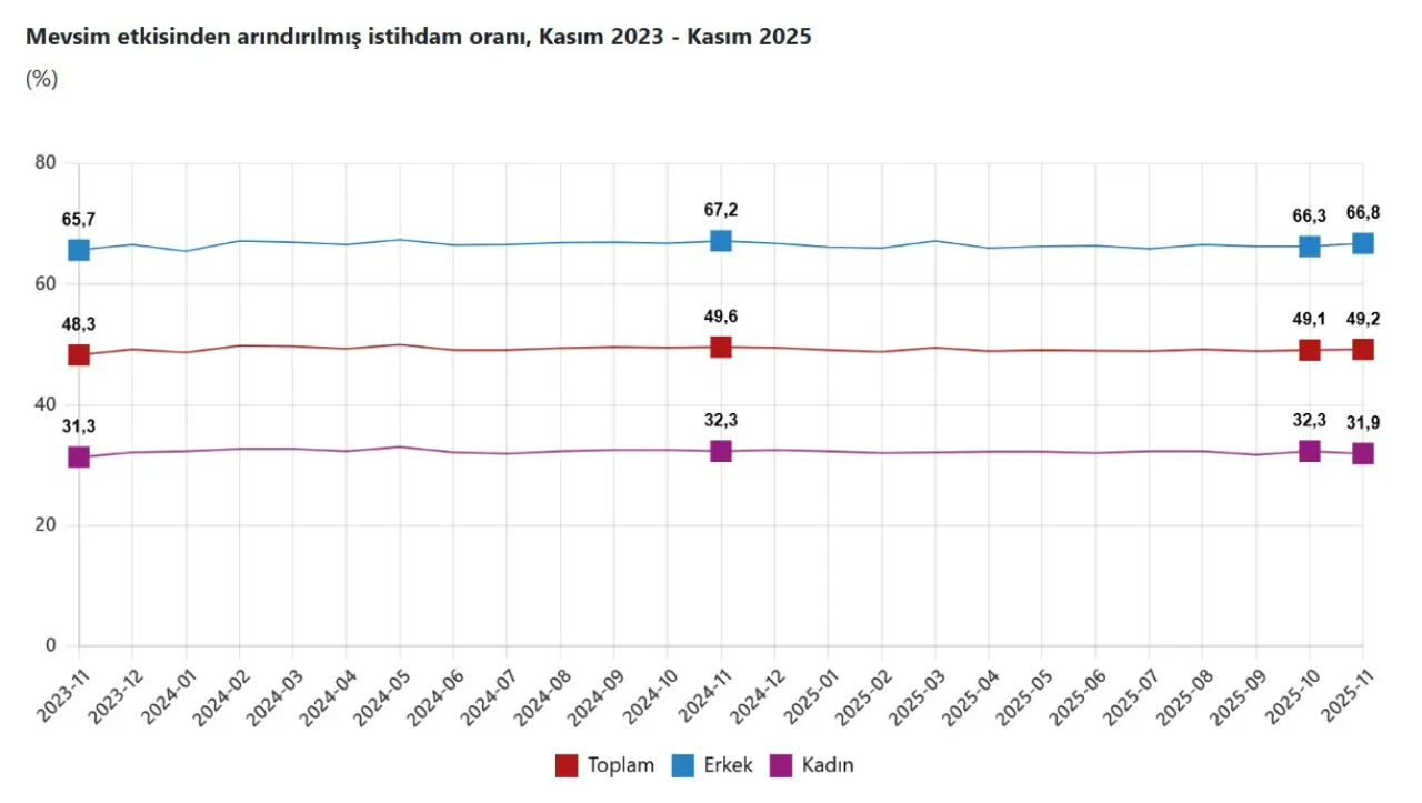 Kasım ayında istihdam edilenlerin sayısı bir önceki aya göre 75 bin kişi artarak 32 milyon 737 bin kişiye ulaştı. İstihdam oranı ise 0,1 puanlık artışla yüzde 49,2 oldu.