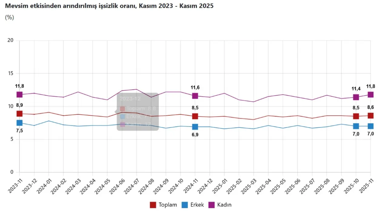 Türkiye’de işgücü piyasasına ilişkin son tablo, işsizliğin yeniden yukarı yönlü seyrettiğine işaret etti. Türkiye İstatistik Kurumu tarafından açıklanan Kasım 2025 İşgücü İstatistiklerine göre, mevsim etkisinden arındırılmış işsizlik oranı bir önceki aya kıyasla 0,1 puan artarak yüzde 8,6 seviyesinde gerçekleşti.