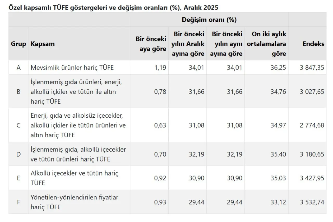 Özel kapsamlı TÜFE göstergeleri olarak bilinen çekirdek enflasyon verileri de yüksek seyrini sürdürdü. İşlenmemiş gıda ürünleri, enerji, alkollü içkiler ve tütün ile altın hariç hesaplanan B göstergesine göre yıllık enflasyon yüzde 31,66 oldu. Bu göstergede aylık artış ise yüzde 0,78 olarak kaydedildi. Diğer çekirdek göstergelere bakıldığında; mevsimlik ürünler hariç TÜFE’de yıllık artış yüzde 34,01, enerji, gıda ve alkolsüz içecekler ile alkollü içkiler ve tütün hariç TÜFE’de yüzde 31,08, yönetilen-yönlendirilen fiyatlar hariç TÜFE’de ise yüzde 29,44 olarak hesaplandı.