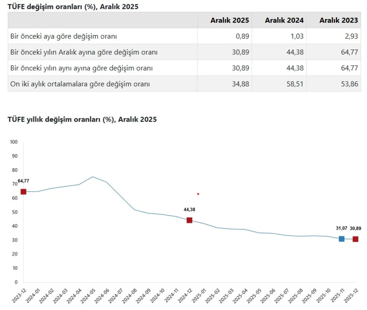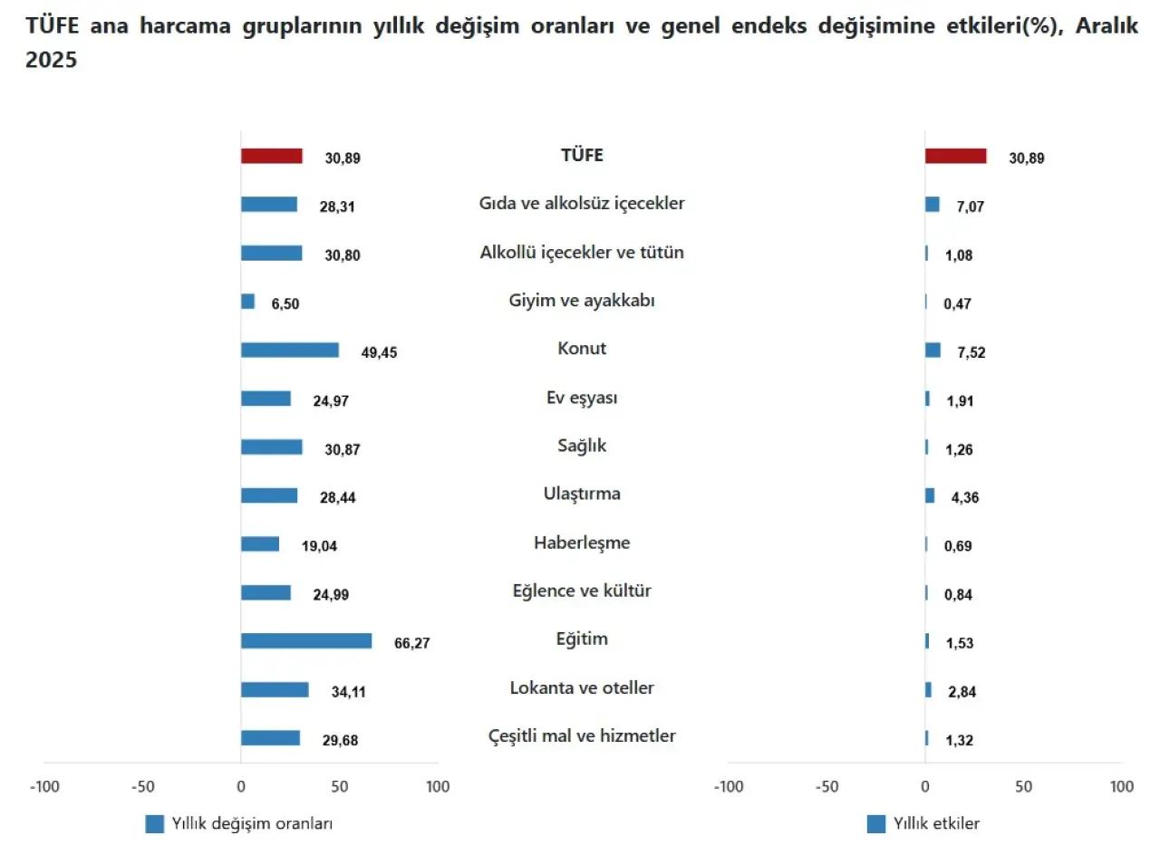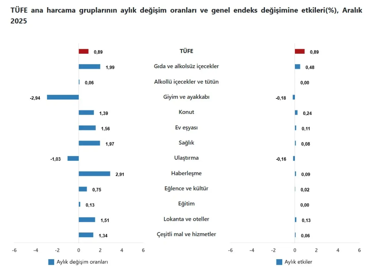 2025 yılının son enflasyon verileri açıklandı. Türkiye İstatistik Kurumu (TÜİK) tarafından yayımlanan Tüketici Fiyat Endeksi (TÜFE) sonuçlarına göre, Aralık ayında tüketici fiyatları bir önceki aya kıyasla yüzde 0,89 arttı. Yıllık enflasyon ise yüzde 30,89 olarak gerçekleşti. Böylece 2025 yılı, yıllık bazda yüzde 30’un üzerinde bir enflasyon oranıyla tamamlandı.