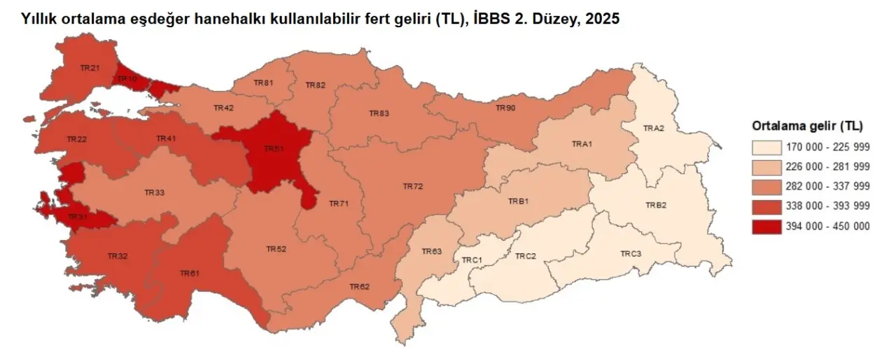 Türkiye genelinde yıllık ortalama hanehalkı kullanılabilir geliri, bir önceki yıla göre %76,7 artarak 662 bin 414 TL’ye yükseldi. Eşdeğer hanehalkı kullanılabilir fert geliri ise 332 bin 882 TL oldu. Hanehalkı türlerine göre en yüksek gelir, 418 bin 025 TL ile tek kişilik hanelerde görülürken, en düşük gelir 264 bin 413 TL ile geniş aile yapısına sahip hanelerde kaydedildi.