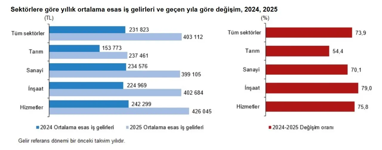 Sektörel bazda en yüksek ortalama gelir hizmet sektöründe, en düşük gelir ise tarım sektöründe gerçekleşti. Yıllık gelir artışında ise inşaat sektörü %79 ile ilk sırada yer aldı.