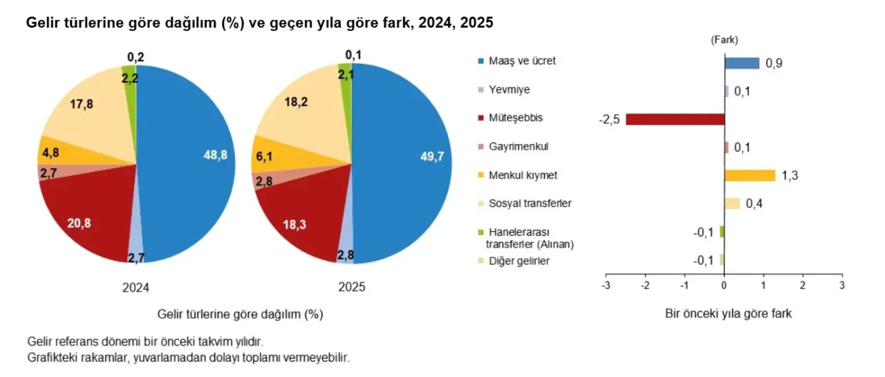 Toplam gelir içinde en büyük pay %49,7 ile maaş ve ücret gelirlerine ait oldu. Müteşebbis gelirlerinin payı %18,3’e gerilerken, sosyal transferlerin payı %18,2 olarak hesaplandı. Sosyal transferlerin büyük bölümünü ise emekli ve dul-yetim aylıkları oluşturdu. Eğitim düzeyi yükseldikçe gelir artışı da hızlandı. Yıllık ortalama esas iş geliri: