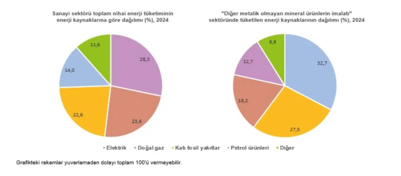 Sanayi genelinde en fazla tüketilen enerji kaynağı 485 bin 163 terajul ile elektrik oldu. Elektriği yüzde 23,6 ile doğal gaz, yüzde 22,6 ile katı fosil yakıtlar, yüzde 14 ile petrol ürünleri izledi. Bu veriler, üretim süreçlerinde elektriğin belirleyici rolünü koruduğunu, ancak fosil kaynaklara bağımlılığın hâlâ yüksek olduğunu ortaya koyuyor. Enerji yoğunluğu en yüksek sektör olan “diğer metalik olmayan mineral ürünler” grubunda en çok tüketilen kaynak yüzde 32,7 ile petrol ürünleri oldu. Bu sektörde petrolü,