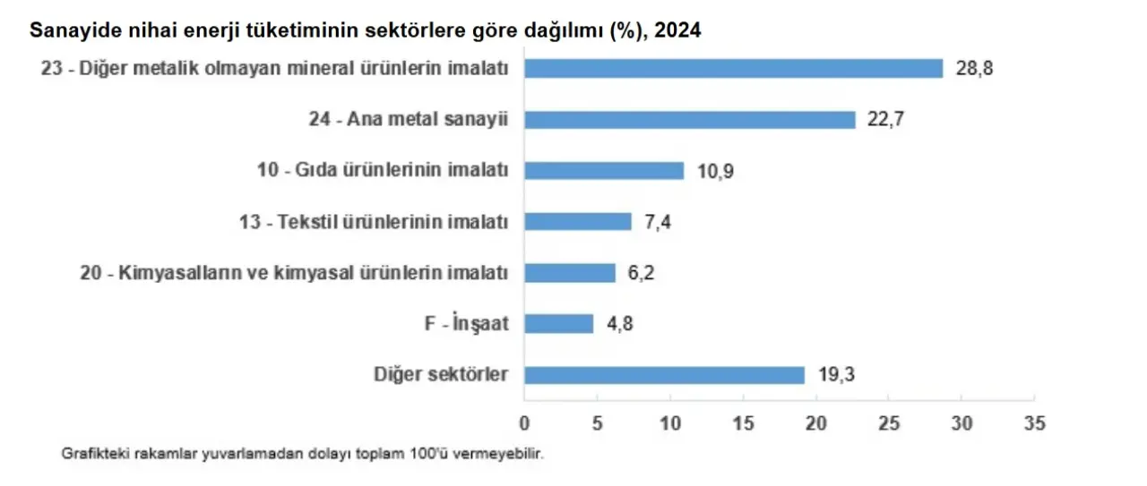 Kimya sektörünün payı yüzde 6,2, inşaat sektörünün payı ise %4,8 olarak kaydedildi. Bu tablo, enerji yoğun sektörlerin hâlâ Türkiye sanayisinin omurgasını oluşturduğunu gösteriyor.