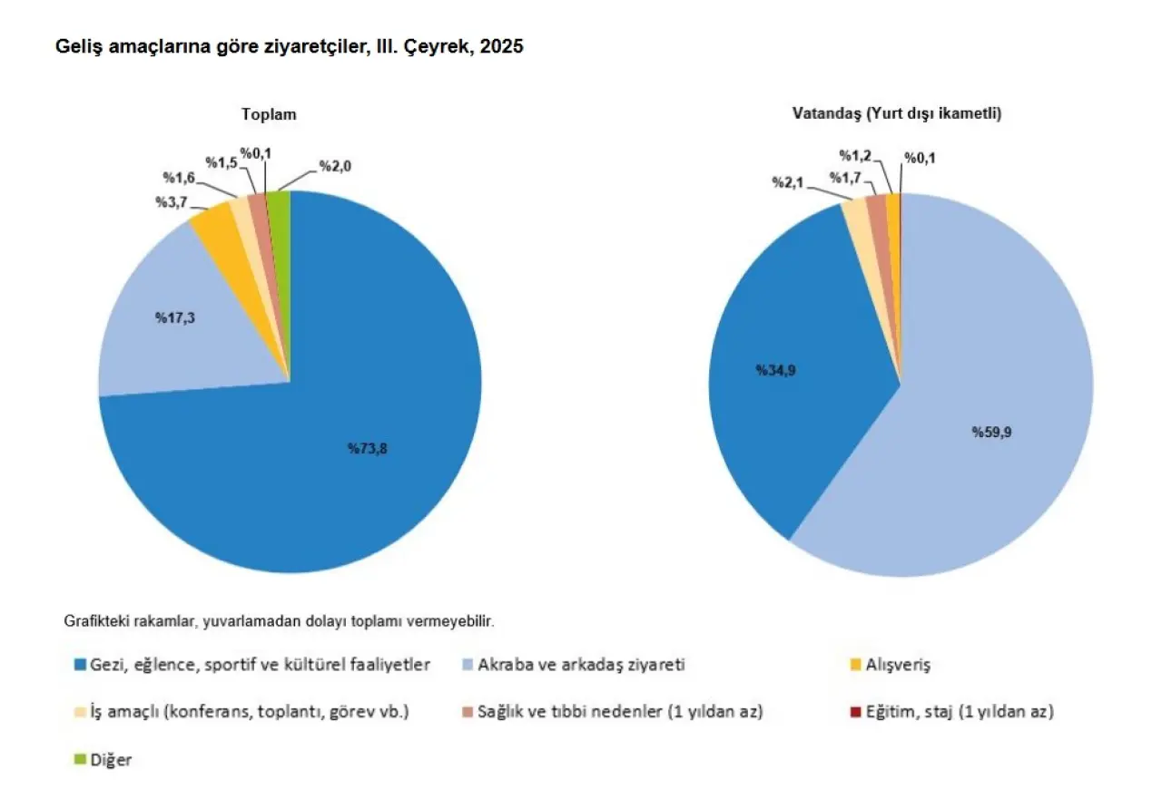 Ziyaretçilerin %73,8’i Türkiye’ye “gezi, eğlence, sportif ve kültürel faaliyetler” amacıyla geldi. Bunu %17,3 ile akraba-arkadaş ziyareti ve %3,7 ile alışveriş amaçlı ziyaretler izledi. Yurt dışında yaşayan Türk vatandaşlarının ise %59,9’u Türkiye’ye “akraba ve arkadaş ziyareti” için geldi. Bu tablo, Türkiye’nin turistik destinasyon olarak konumunu korurken, diaspora turizminin de hâlâ önemli bir gelir kaynağı olduğunu gösteriyor. Yurt dışına çıkan Türk vatandaşlarının harcamaları da arttı. Toplam turizm gideri bir önceki yılın aynı dönemine göre %32,3 artarak 2 milyar 479 milyon dolar oldu. Bu harcamaların 2 milyar doları kişisel, 444 milyon doları ise paket tur ödemelerinden oluştu. Yurt dışını ziyaret eden vatandaş sayısı %3 artışla 3 milyon 383 bin kişiye ulaştı. Kişi başı ortalama harcama ise 733 dolar olarak gerçekleşti.