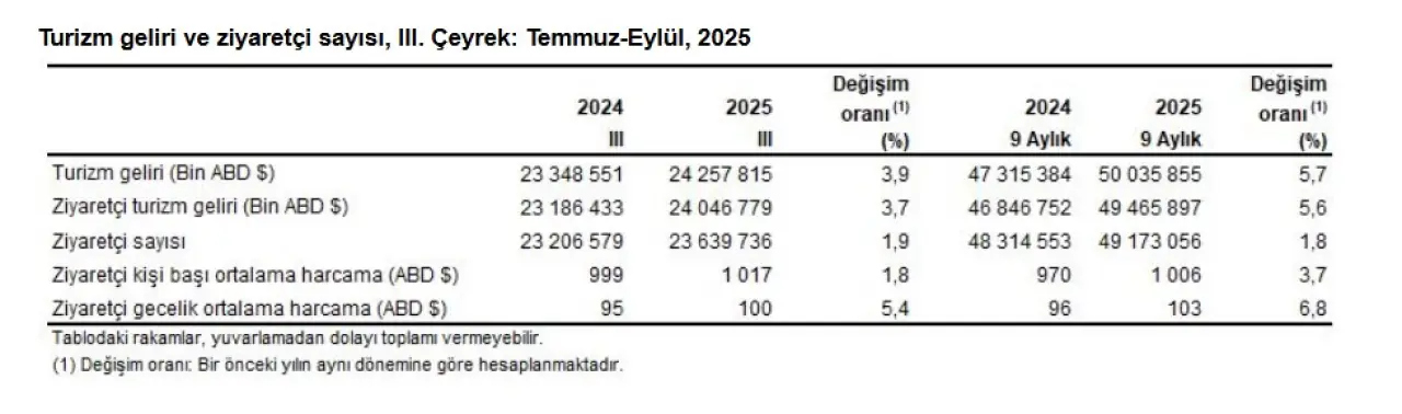 Uzmanlara göre 2025’in üçüncü çeyreğinde turizm gelirlerindeki artış, geçen yıla göre ılımlı ama istikrarlı bir büyümeye işaret ediyor. Avrupa pazarındaki durgunluk ve döviz kurlarındaki dalgalanmalar, artış hızını sınırlasa da Türkiye’nin turizm gelirinde rekor seviyelerin korunduğu değerlendiriliyor. Turizm sektörünün yılın son çeyreğinde iç turizm hareketliliği ve Orta Doğu pazarı sayesinde pozitif ivmesini sürdüreceği öngörülüyor.