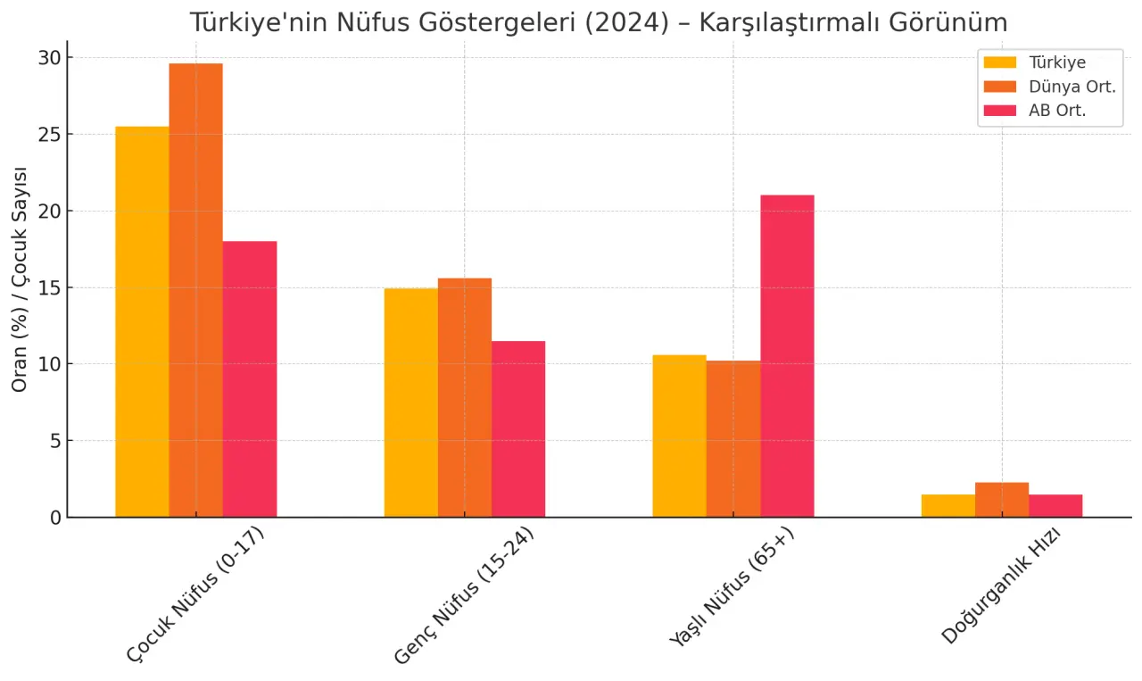 2024 yılı verileri, Türkiye'nin nüfus yapısında dönüşüm sürecinin sürdüğünü gösteriyor. Genç ve çocuk nüfusu hâlâ güçlü olmakla birlikte, doğurganlık hızındaki düşüş ve yaşlı nüfus oranındaki artış demografik yapıda denge arayışını gündeme getiriyor. Bu görünüm, sağlık, eğitim, sosyal güvenlik ve istihdam politikalarının yaşa göre yeniden şekillendirilmesi gerekliliğini ortaya koyuyor. Türkiye’nin AB ülkeleriyle kıyaslandığında genç ve çocuk nüfusta önde olması, geleceğe yönelik stratejik avantaj olabilir; ancak bu potansiyelin sürdürülebilir kalkınma ile desteklenmesi kritik önem taşıyor.