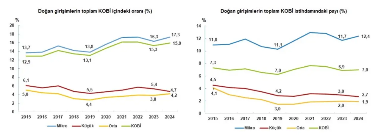 KOBİ’lerde girişim doğum oranı 2024 yılında yüzde 15,9 olarak hesaplandı. En yüksek doğum oranı mikro ölçekli girişimlerde görüldü. Aynı zamanda yeni kurulan KOBİ’lerin istihdam içindeki payı da artış gösterdi. 2024 yılında Türkiye’nin toplam ihracatının yüzde 29,6’sı, ithalatının ise yüzde 15,9’u KOBİ’ler tarafından gerçekleştirildi. KOBİ ihracatının: