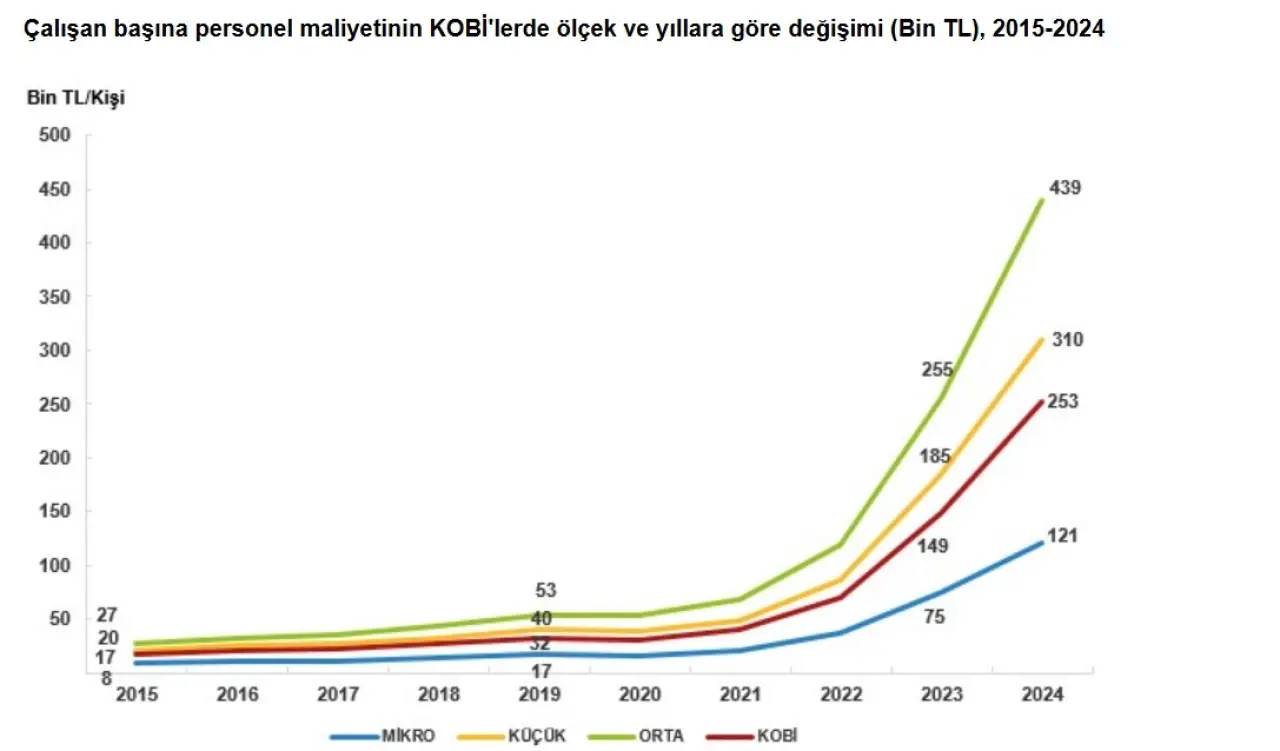 Benzer bir artış çalışan başına personel maliyetlerinde de görüldü. 2015 yılında KOBİ’lerde çalışan başına ortalama personel maliyeti 17 bin TL iken, 2024 yılında bu tutar 253 bin TL oldu. 2024 itibarıyla: