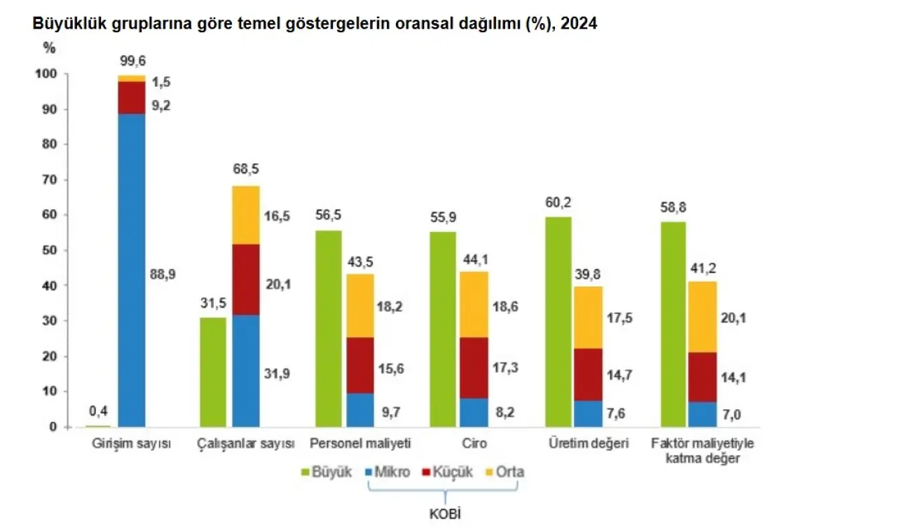 2024 yılı itibarıyla sanayi ve hizmet sektörlerinde faaliyet gösteren 3 milyon 928 bin girişim, KOBİ statüsünde yer aldı. Bu işletmeler, toplam girişim sayısının yüzde 99,6’sını oluşturdu. KOBİ’lerin ekonomi içindeki payı yalnızca sayısal üstünlükle sınırlı kalmadı. Aynı yıl itibarıyla: