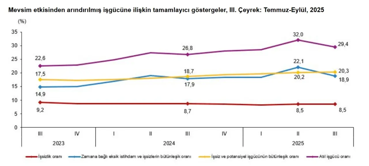 Zamana bağlı eksik istihdam, potansiyel işgücü ve işsizlerden oluşan atıl işgücü oranı yüzde 29,4 olarak gerçekleşti. Bir önceki çeyreğe göre 2,6 puanlık iyileşme olsa da oran hâlâ oldukça yüksek.