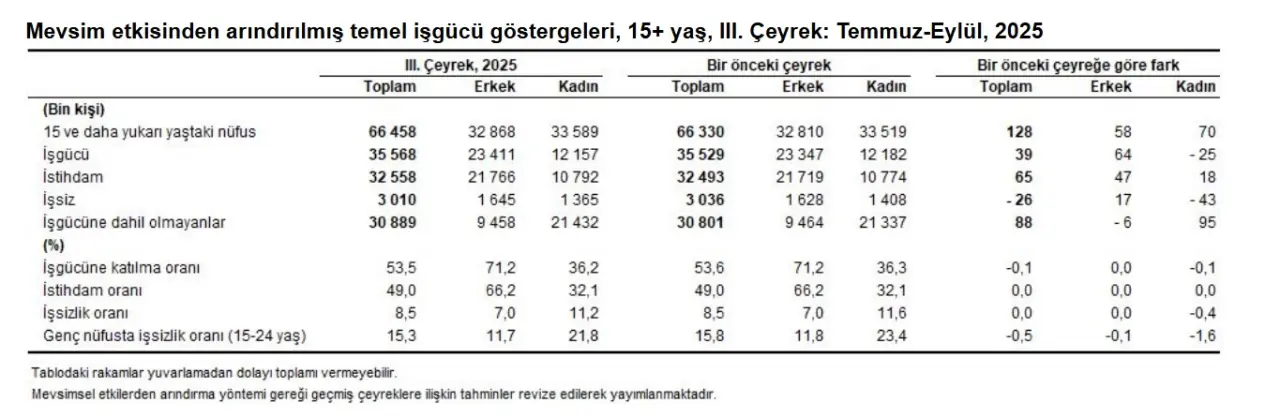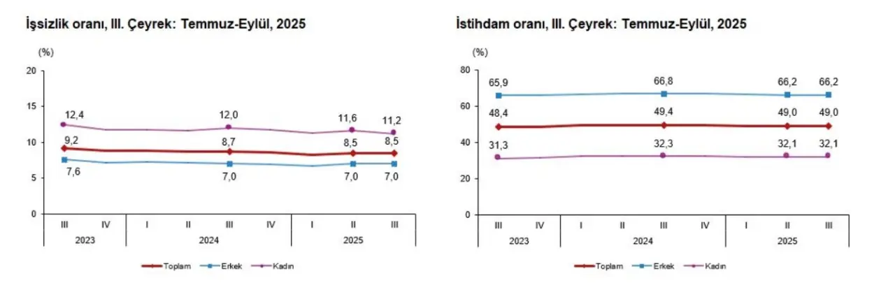 Türkiye’nin 2025 yılı III. çeyrek (Temmuz–Eylül) işgücü verileri açıklandı. Ekonomideki genel yavaşlamaya rağmen işsizlik oranı çeyrek bazında değişmeyerek yüzde 8,5 seviyesinde kaldı. Ancak atıl işgücü oranının hâlâ yüksek seviyelerde bulunması, işgücü piyasasında toparlanmanın sınırlı olduğunu ortaya koydu. Hanehalkı İşgücü Araştırması’na göre 15 yaş ve üzeri nüfusta işsiz sayısı üçüncü çeyrekte 26 bin kişi azalarak 3 milyon 10 bin kişiye indi.