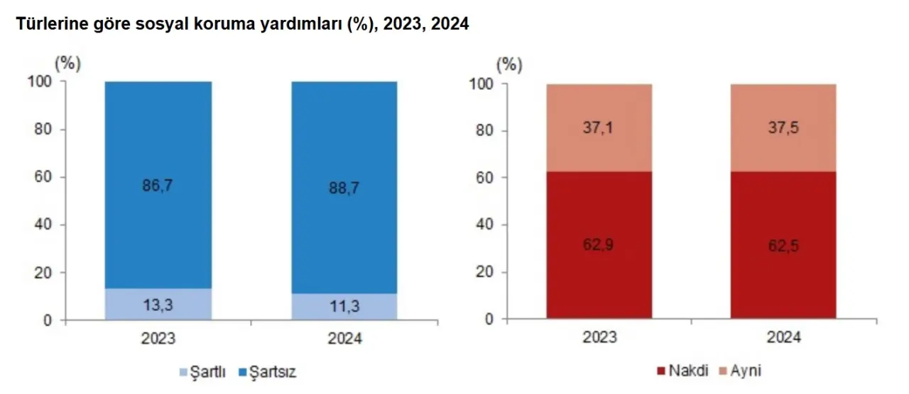 2024 yılında yapılan sosyal koruma yardımlarının %11,3’ü şartlı yardımlar kapsamında gerçekleştirildi. Şartlı yardımlar içinde: