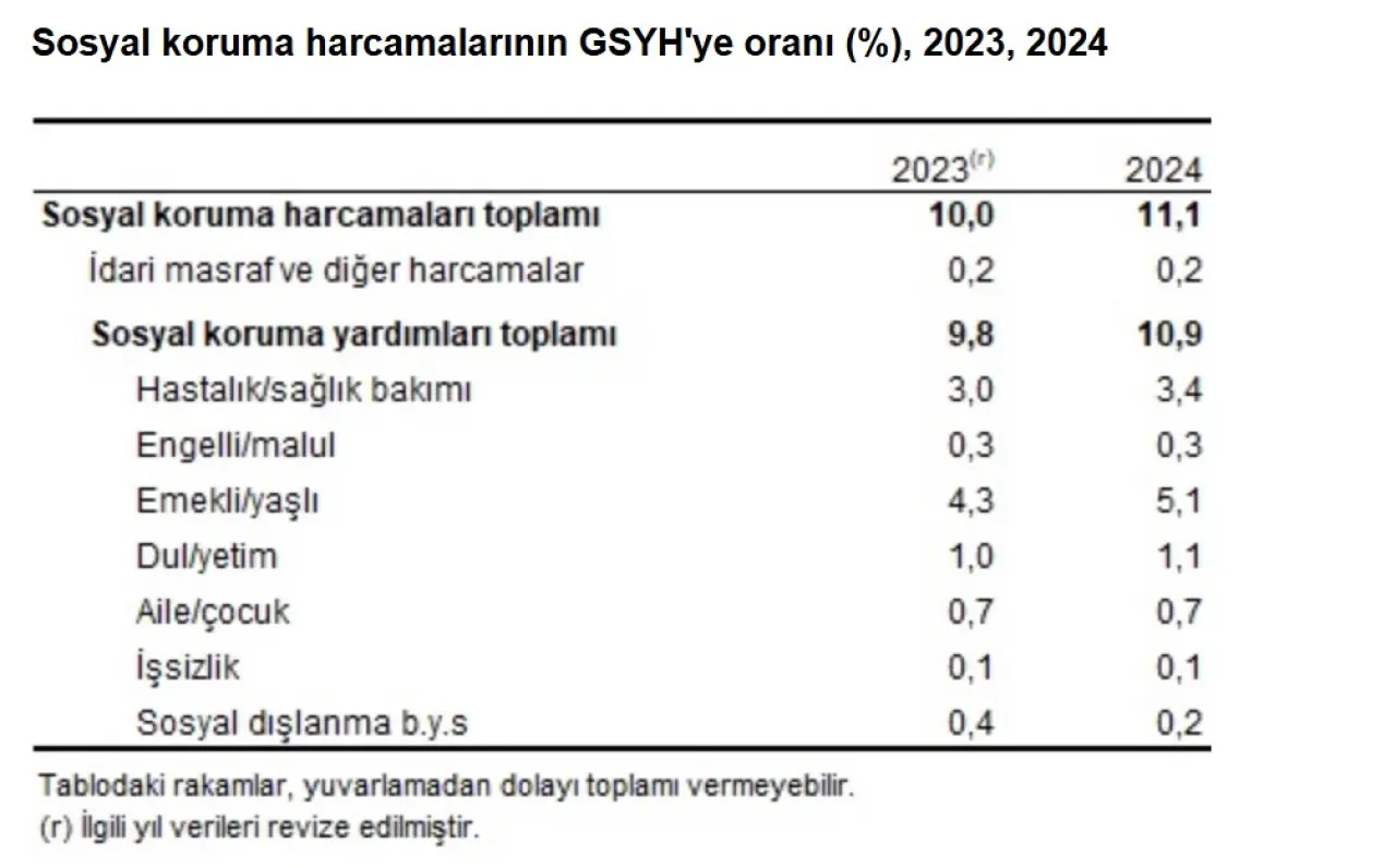 Verilere göre, sosyal koruma harcamalarının gayrisafi yurt içi hasıla (GSYH) içindeki payı 2024 yılında %11,1 olarak gerçekleşti. Sadece sosyal koruma yardımlarının GSYH içindeki payı ise %10,9 oldu. Risk grupları bazında bakıldığında: