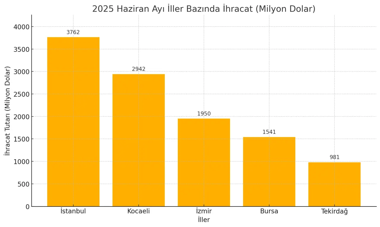 Haziran 2025 döneminde iller bazında ihracat şampiyonu, 3 milyar 762 milyon dolarlık ihracatla İstanbul oldu. Marmara Bölgesi’nin sanayi ve liman kapasitesini arkasına alan Kocaeli, 2 milyar 942 milyon dolarla ikinci sırada yer alırken; Ege’nin sanayi devi İzmir, 1 milyar 950 milyon dolarlık performansla üçüncü sıraya yerleşti. Bursa 1 milyar 541 milyon dolarla dördüncü sırada yer aldı. Tekirdağ ise 981 milyon dolarlık ihracatla ilk beşi tamamladı.