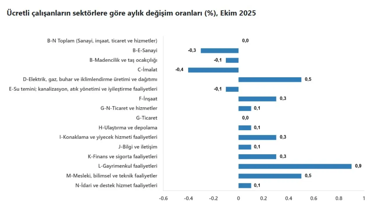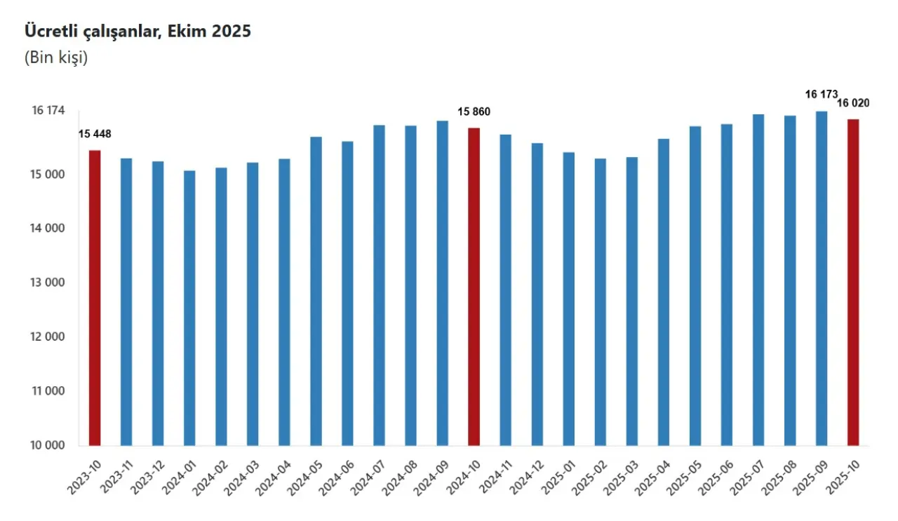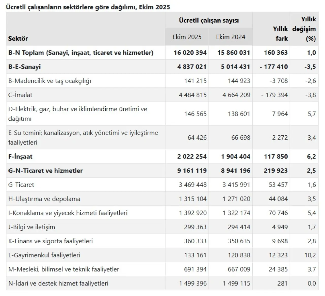 Türkiye’de istihdam cephesinde ılımlı bir toparlanma sinyali gelirken, sektörler arasında belirgin bir ayrışma dikkat çekti. Ücretli Çalışan İstatistikleri – Ekim 2025 verileri, toplam istihdamda yıllık artışa işaret ederken sanayi sektöründeki daralmanın sürdüğünü ortaya koydu. Sanayi, inşaat ve ticaret-hizmet sektörleri toplamında ücretli çalışan sayısı, 2025 yılı Ekim ayında geçen yılın aynı ayına göre yüzde 1,0 arttı.