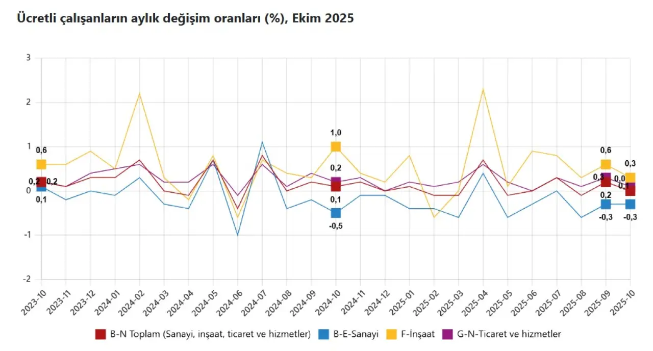 Ekim ayında toplam ücretli çalışan sayısı bir önceki aya göre değişim göstermedi. Ancak alt sektörlerde sınırlı hareketler izlendi: