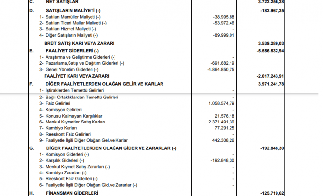 BRÜT SATIŞ KARI VEYA ZARARI 3.539.289,03