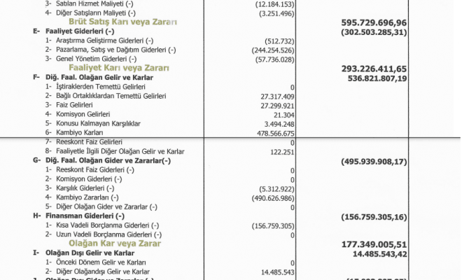Olağan dışı geliri 14 milyon Türk Lirası'nın üzerinde gerçekleşen ancak olağan dışı giderleri de 16 milyon Türk Lirası civarında olan şirketin dönem net karı ise 175.840.651,08 TL (175 milyon 840 bin 651 lira 8 kuruş) seviyesinde gerçekleşmiştir.