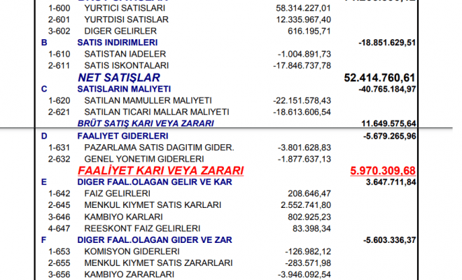 Şirketin gelir tablosu aşağıdaki gibidir: izfas-izmir-firca-gelir-tablosu-kar-yazdi-2021-gelir-temettu-kar-payi-ne-kadar-zaman Bu mali tablo SPK mevzuatına göre raporlanan değerleri yansıtma-makta olup, V.U.K hükümlerine göre düzenlenmiştir . İŞLETME AYRINTILI GELİR TABLOSU CARİ DÖNEM 31.12.2020 A BRUT SATISLAR 71.266.390,12 1-600 YURTICI SATISLARI 58.314.227,01 2-601 YURTDISI SATISLAR 12.335.967,40 3-602 DIGER GELIRLER 616.195,71 B SATIS INDIRIMLERI -18.851.629,51 1-610 SATISTAN IADELER -1.004.891,73 2-611 SATIS ISKONTALARI -17.846.737,78 NET SATIŞLAR 52.414.760,61 C SATISLARIN MALIYETI -40.765.184,97 1-620 SATILAN MAMULLER MALIYETI -22.151.578,43 2-621 SATILAN TICARI MALLAR MALIYETI -18.613.606,54 BRÜT SATIŞ KARI VEYA ZARARI 11.649.575,64 D FAALIYET GIDERLERI -5.679.265,96 1-631 PAZARLAMA SATIS DAGITIM GIDER. -3.801.628,83 2-632 GENEL YONETIM GIDERLERI -1.877.637,13 FAALİYET KARI VEYA ZARARI 5.970.309,68 E DIGER FAAL.OLAGAN GELIR VE KAR 3.647.711,84 1-642 FAIZ GELIRLERI 208.646,47 2-645 MENKUL KIYMET SATIS KARLARI 2.552.741,80 3-646 KAMBIYO KARLARI 802.925,23 4-647 REESKONT FAIZ GELIRLERI 83.398,34 F DIGER FAAL.OLAGAN GIDER VE ZAR -5.603.336,37 1-653 KOMISYON GIDERLERI -126.982,12 2-655 MENKUL KIYMET SATIS ZARARLARI -283.571,98 3-656 KAMBIYO ZARARLARI -3.946.092,54 4-657 REESKONT FAIZ GIDERLERI -1.246.689,73 G FINANSMAN GIDERLERI -1.458.119,54 1-660 KISA VADELI BORCLANMA GIDERLER -1.458.119,54 OLAĞAN KAR VEYA ZARAR 2.556.565,61 H OLAGANDISI GELIR VE KARLAR 12.980,43 1-679 DIGER OLAGANDISI GELIR VE KARL 12.980,43 I OLAGANDISI GİDER VE ZARARLAR 0,00 1-689 DIGER OLAGANDISI GİDER VE ZARAR 0,00 DÖNEM KARI VEYA ZARARI 2.569.546,04 DON.KARI VER.VE DIG.YAS.YUK.K. DÖNEM NET KARI VEYA ZARARI 2.569.546,04