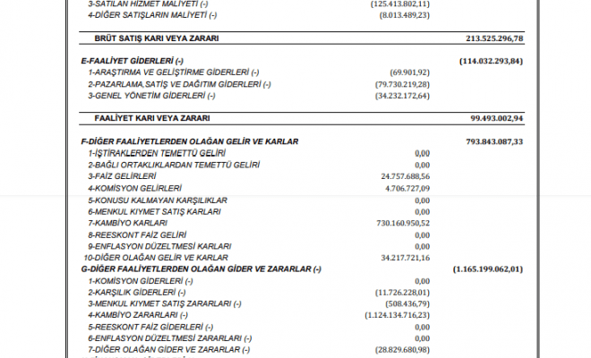 İzmir Demir Çelik’in gelir tablosu aşağıdaki gibidir: izmdc-izmir-demir-celik-gelir-tablosu-zarar-yazdi-2020-2021-kar-payi-temettu Aşağıdaki tablo geçici vergi beyannamesi ekinde vergi dairesine sunulmuş olup,sermaye piyasası mevzuatına göre düzenlenmemiştir. İZMİR DEMİR ÇELİK SANAYİ AŞ AYRINTILI GELİR TABLOSU (VUK) 31.12.2020 A -BRÜT SATIŞLAR 4.683.723.749,95 1-YURTİÇİ SATIŞLAR 3.593.299.080,72 2-YURTDIŞI SATIŞLAR 1.090.424.362,17 3-DİĞER GELİRLER 307,06 B-SATIŞ İNDİRİMLERİ (-) (9.137.118,09) 1-SATIŞTAN İADELER (-) (4.459.153,58) 2-SATIŞ İSKONTOLARI (-) 0,00 3-DİĞER İNDİRİMLER (-) (4.677.964,51) C-NET SATIŞLAR 4.674.586.631,86 D-SATIŞLARIN MALİYETİ (-) (4.461.061.335,08) 1-SATILAN MAMULLER MALİYETİ (-) (4.295.390.048,72) 2-SATILAN TİCARİ MALLAR MALİYETİ (-) (32.243.995,02) 3-SATILAN HİZMET MALİYETİ (-) (125.413.802,11) 4-DİĞER SATIŞLARIN MALİYETİ (-) (8.013.489,23) BRÜT SATIŞ KARI VEYA ZARARI 213.525.296,78 E-FAALİYET GİDERLERİ (-) (114.032.293,84) 1-ARAŞTIRMA VE GELİŞTİRME GİDERLERİ (-) (69.901,92) 2-PAZARLAMA,SATİŞ VE DAĞITIM GİDERLERİ (-) (79.730.219,28) 3-GENEL YÖNETİM GİDERLERİ (-) (34.232.172,64) FAALİYET KARI VEYA ZARARI 99.493.002,94 F-DİĞER FAALİYETLERDEN OLAĞAN GELİR VE KARLAR 793.843.087,33 1-İŞTİRAKLERDEN TEMETTÜ GELİRİ 0,00 2-BAĞLI ORTAKLIKLARDAN TEMETTÜ GELİRİ 0,00 3-FAİZ GELİRLERİ 24.757.688,56 4-KOMİSYON GELİRLERİ 4.706.727,09 5-KONUSU KALMAYAN KARŞILIKLAR 0,00 6-MENKUL KIYMET SATIŞ KARLARI 0,00 7-KAMBİYO KARLARI 730.160.950,52 8-REESKONT FAİZ GELİRİ 0,00 9-ENFLASYON DÜZELTMESİ KARLARI 0,00 10-DİĞER OLAĞAN GELİR VE KARLAR 34.217.721,16 G-DİĞER FAALİYETLERDEN OLAĞAN GİDER VE ZARARLAR (-) (1.165.199.062,01) 1-KOMİSYON GİDERLERİ (-) 0,00 2-KARŞILIK GİDERLERİ (-) (11.726.228,01) 3-MENKUL KIYMET SATIŞ ZARARLARI (-) (508.436,79) 4-KAMBİYO ZARARLARI (-) (1.124.134.716,23) 5-REESKONT FAİZ GİDERLERİ (-) 0,00 6-ENFLASYON DÜZELTMESİ ZARARLARI (-) 0,00 7-DİĞER OLAĞAN GİDER VE ZARARLAR (-) (28.829.680,98) H-FİNANSMAN GİDERLERİ (-) (126.746.921,78) 1-KISA VADELİ BORÇLANMA GİDERLERİ (-) (119.604.922,49) 2-UZUN VADELİ BORÇLANMA GİDERLERİ (-) (7.141.999,29) OLAĞAN KAR VEYA ZARAR (398.609.893,52) I-OLAĞANDIŞI GELİR VE KARLAR 32.480.695,00 1-ÖNCEKİ DÖNEM GELİR VE KARLARI 0,00 2-DİĞER OLAĞANDIŞI GELİR VE KARLAR 32.480.695,00 J-OLAĞANDIŞI GİDER VE ZARARLAR (6.369.213,41) 1-ÇALIŞMAYAN KISIM GİDER VE ZARARLARI (-) (6.298.792,65) 2-ÖNCEKİ DÖNEM GİDER VE ZARARLAR (-) 0,00 3-DİĞER OLAĞANDIŞI GİDER VE ZARARLAR (-) (70.420,76) DÖNEM KARI VEYA ZARARI (372.498.411,93) K-DÖNEM KARI VERGİ VE DİĞ.YASAL YÜKÜML. KARŞL.(-) 0,00 DÖNEM NET KARI VEYA ZARARI 0,00 (372.498.411,93)