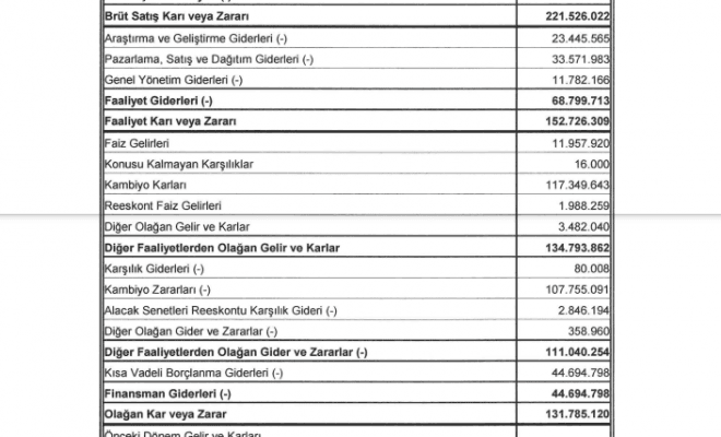 792 milyon seviyesinin üzerinde gerçekleşen satışların maliyeti kaleminin akabinde şirketin brüt satış karı 221 milyon Türk Lirası düzeyinin üzerinde olmuştur. 68 milyon TL'yi aşan faaliyet gideri kalemi sonrasında faaliyet karı 152 milyon TL'nin üzerinde gerçekleşmiştir.