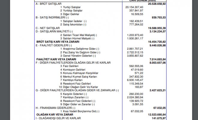 Link Bilgisayar gelir tablosu aşağıdaki gibidir: link-link-bilgisayar-gelir-tablosu-kar-yazdi-2021-temettu-taihleri-kar-payi-ne-zaman-kadar LİNK BİLGİSAYAR SİSTEMLERİ YAZ.VE DON.SAN.VE TİC.A.Ş. 01.01.2020-31.12.2020 DÖNEMİ GELİR TABLOSU "Aşağıdaki tablo geçici vergi beyannamesi ekinde vergi dairesine sunulmuş olup, sermaye piyasası mevzuatına göre düzenlenmemiştir." CARİ DÖNEM (2020) A - BRÜT SATIŞLAR 20.528.658,92 1 Yurtiçi Satışlar 20.154.307,40 2 Yurtdışı Satışlar 357.841,97 3 Diğer Gelirler 16.509,55 B - SATIŞ İNDİRİMLERİ (-) 939.703,53 1 Satıştan İadeler (-) 162.439,51 2 Satış İskontoları (-) 777.264,02 C - NET SATIŞLAR 19.588.955,39 D - SATIŞLARIN MALİYETİ (-) 3.134.234,57 2 Satılan Ticari Mal Maliyeti(-) 1.203.973,40 3 Satılan Hizmet Maliyeti (-) 1.930.261,17 BRÜT SATIŞ KARI VEYA ZARARI 16.454.720,82 E - FAALİYET GİDERLERİ (-) 9.440.026,98 1 Araştırma Geliştirme Gider.(-) 2.861.707,21 2 Paz,Satış Ve Dağıtım Gider.(-) 2.722.512,15 3 Genel Yönetim Giderleri (-) 3.855.807,62 FAALİYET KARI VEYA ZARARI 7.014.693,84 F - DİĞER FAALİYETLERDEN OLAĞAN GELİR VE KARLAR 8.003.657,06 3 Faiz Gelirleri 562.555,06 4 Komisyon Gelirleri 47.019,60 5 Konusu Kalmayan Karşılıklar 571,22 6 Menkul Kıymet Satış Karları 347.832,30 7 Kambiyo Karları 6.930.145,47 8 Reeskont Faiz Gelirleri 115.349,54 10 Diğer Olağan Gelir Ve Karlar 183,87 G - DİĞER FAALİYETLERDEN OLAĞAN GİDER VE ZARARLAR (-) 2.427.623,21 5 Karşılık Giderleri (-) 260.230,00 7 Kambiyo Zararları (-) 2.024.380,94 8 Reeskont Faiz Giderleri (-) 139.920,72 9 Diğer Gider ve Zararlar (-) 3.091,55 H - FİNANSMAN GİDERLERİ (-) 67.032,05 1 Kısa Vadeli Borçlanma Gid.(-) 67.032,05 OLAĞAN KAR VEYA ZARAR 12.523.695,64 I - OLAĞANDIŞI GELİR VE KARLAR 141.675,97 10 Diğer Olağandışı Gelir Ve Kar. 141.675,97 J - OLAĞANDIŞI GİDER VE ZARARLAR 0,00 DÖNEM KARI VEYA ZARARI 12.665.371,61 DÖNEM KARI VERGİ KARŞILIĞI 2.329.293,85 DÖNEM NET KARI VEYA ZARARI 10.336.077,76